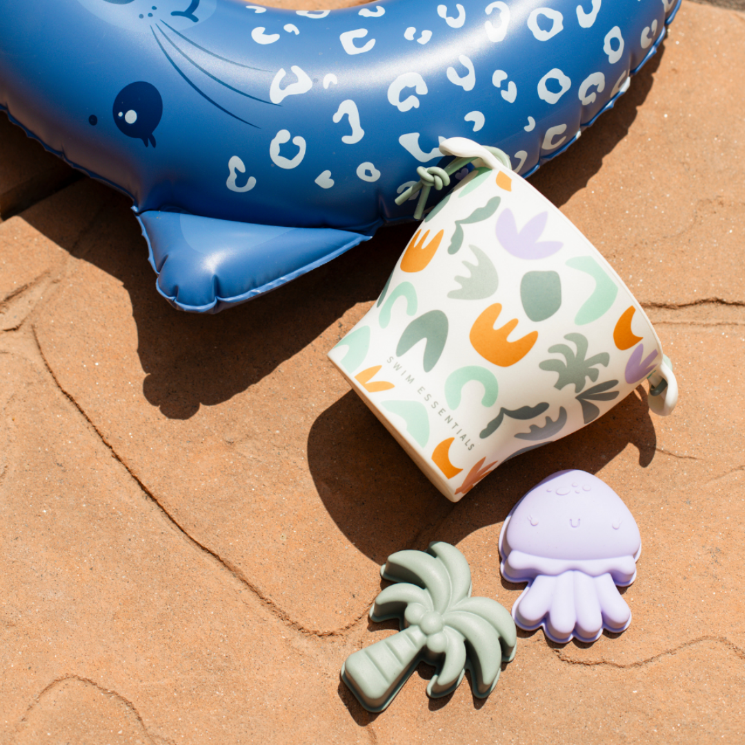 Onze strandspeelset is uitgerust met een vrolijk emmertje, een handig schepje en drie leuke speeltjes waarmee je kleintje eindeloos kan spelen in het zand!